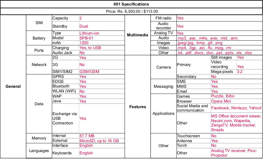 001 Specifications Chart