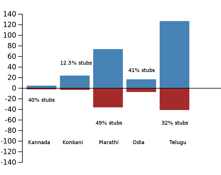 Bar graph showing articles created and stubs created.The bars above x axis show count of all articles created, those in negative y axis show stubs.