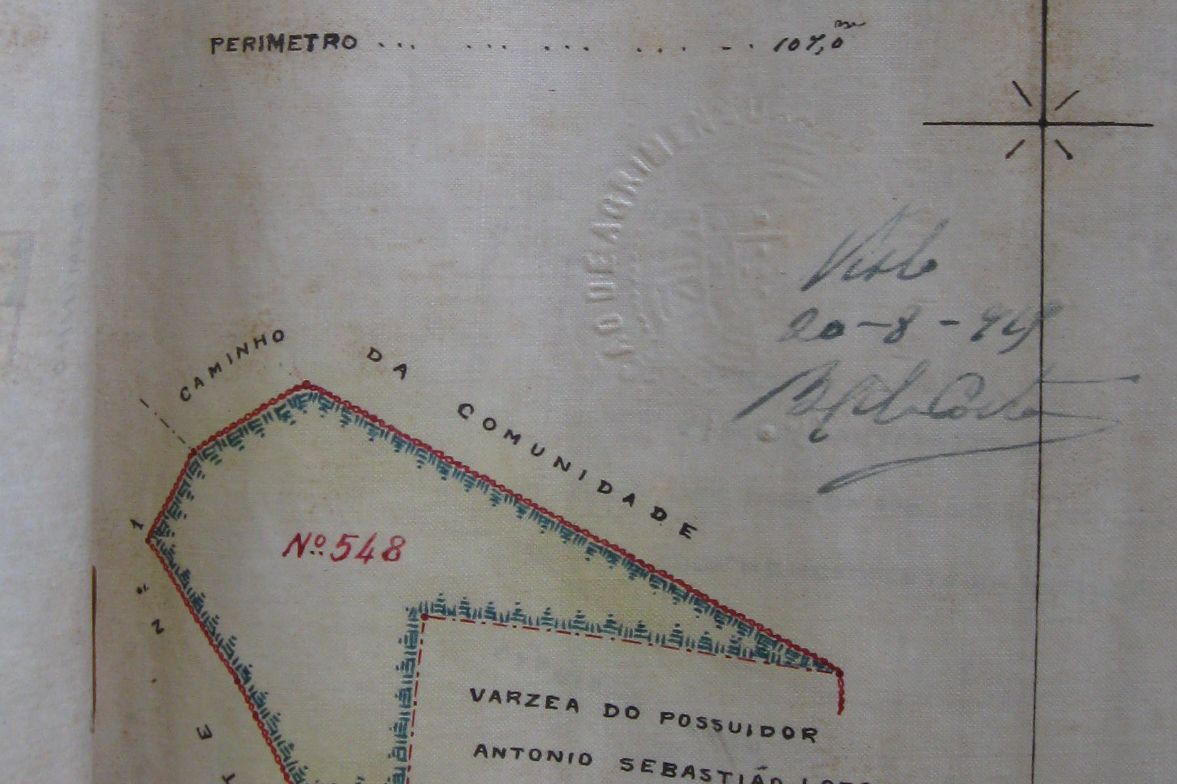 Map with seal of state authority responsible for measurements and records, signature of presiding authority, ownership details, land use details, such as the road alongside the field, and a privately held property.